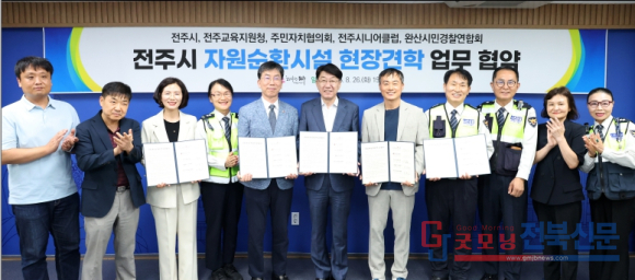 시는 26일 전주교육지원청(교육장 김정기), 전주시주민자치협의회(회장 강민철), 전주시니어클럽(관장 김효춘), 완산시민경찰연합회(회장 성완오)와 ‘지자체와 학교, 지역사회가 함께 협력하는 자원순환시설 견학프로그램’ 운영을 위한 업무협약을 체결했다.
