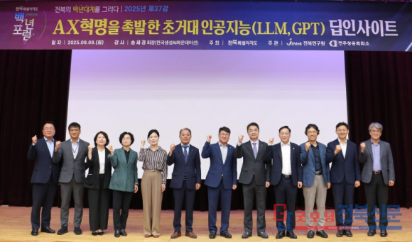 전북연구원은 9일 오전 8시 전북특별자치도청 에서`전북 백년포럼` 제37강을 개최했다. 이번 강연에는 송세경 한국생성AI파운데이션(Koreal Gen AI Foundation; KGAF) 회장이 연사로 나서, ‘AX 혁명을 촉발한 초거대 인공지능(LLM, GPT) 딥인사이트’를 주제로 강연을 펼쳤다.