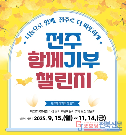 ‘전주함께기부 챌린지’는 전주시민이 함께 어려움에 처한 이웃의 위기 극복을 돕고 다시 일어설 수 있도록 지원하기 위한 것으로, 매월 1만1004원 이상 정기기부를 약정하는 기부천사를 발굴하는 캠페인이다.