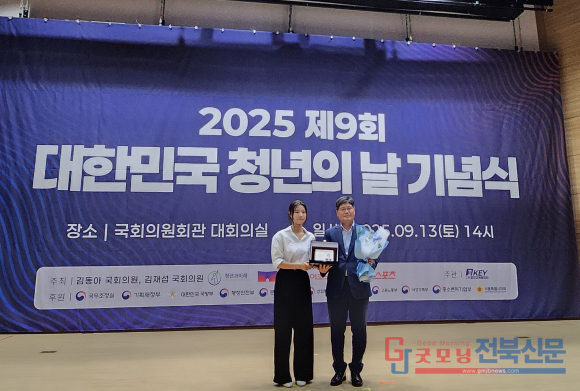 [굿모닝전북신문=최진수기자] 전북특별자치도 고창군이 다시 한번 청년 정책의 모범 지자체임을 입증했다. 고창군은 지난 13일 국회의원회관 대회의실에서 열린 ‘제9회 대한민국 청년의 날 기념식’에서 ‘제8회 청년친화헌정대상 종합대상’을 수상했다. 이는 지난해 소통대상에 이어 2년 연속으로 거머쥔 성과로, ‘청년 살이 고창 시대’를 기치로 내건 민선 8기의 정책이 실질적 결실을 맺었음을 보여준다.