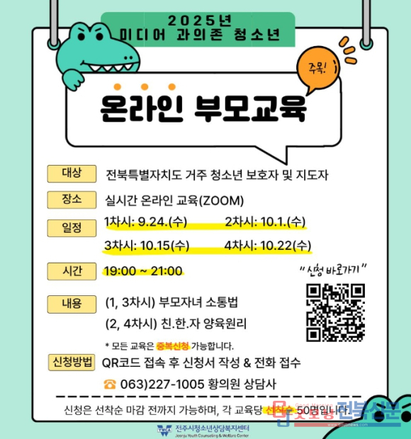 정혜선 전주시청소년상담복지센터장은 “온라인 부모 교육을 통해 우리 자녀들의 미디어 사용 습관을 점검하고, 부모-자녀 간 관계 개선을 통해 가족 간 소통이 원활해지는 계기가 되길 바란다”고 말했다.