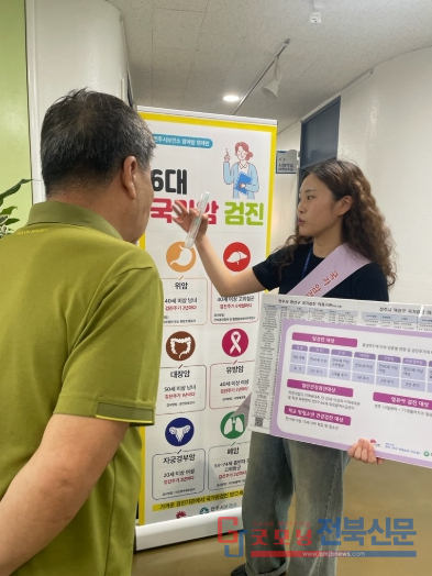 전주시보건소는 지난 15일부터 18일까지 4일간 국가건강검진 참여율을 높이기 위해 아파트단지, 장애인복지시설 등 5곳을 찾아가 시민들의 질병 조기 발견 및 치료를 통한 건강증진을 도모하기 위한 국가건강검진 사업을 홍보하는 캠페인을 전개했다.