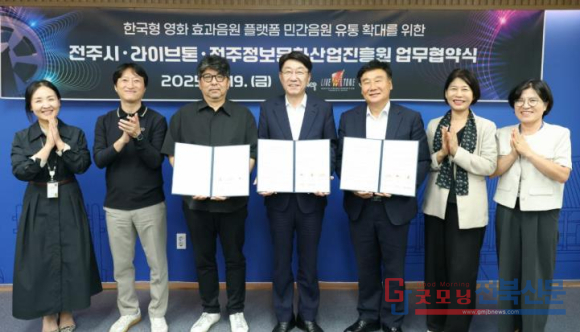 전주시와 (재)전주정보문화산업진흥원, 국내 최대 영화음향 전문기업인 라이브톤(대표 최태영)은 19일 시청 3층 회의실에서 우범기 전주시장과 허전 진흥원장, 최태영 대표 등이 참석한 가운데 ‘한국형 영화 효과음원 플랫폼(케이사운드 라이브러리) 서비스 확산을 위한 업무협약’을 체결했다.