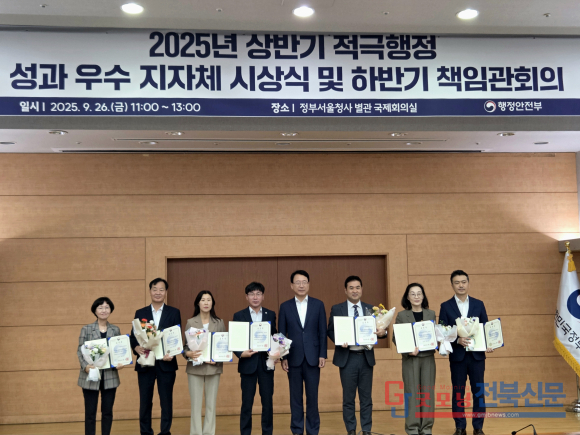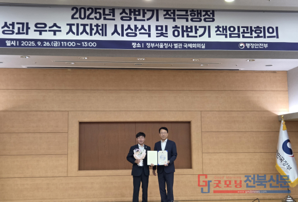 [굿모닝전북신문=최진수기자] 부안군이 다시 한 번 전국 지방행정의 중심에 섰다. 군은 26일 행정안전부가 주관한 2025년 상반기 지방자치단체 적극행정 성과점검에서 2년 연속 우수기관으로 선정돼 행정안전부 장관상을 수상했다고 밝혔다. 이는 단순히 ‘잘한 성적’이 아니라, 행정 현장을 혁신의 무대로 삼아온 권익현 군수의 리더십이 실질적 성과로 입증된 결과다.