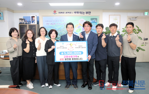 [굿모닝전북신문=최진수기자] 지난 29일, 부안군과 군산시 공무직 노동조합이 고향사랑기부제를 통해 지역 간 상생 협력의 길을 열었다. 부안군 자치단체노동조합(위원장 신희중)과 군산시 공무직노동조합(위원장 오은정)은 각각 500만 원씩을 상호 기부하며 ‘고향사랑’이라는 이름 아래 지역 간 우애와 연대를 확실히 다졌다. 기부 총액은 1,000만 원, 단순한 금전적 행위 이상의 깊은 의미를 담고 있다.