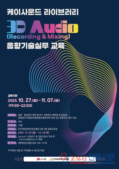 교육은 약 2주간 전주정보문화산업진흥원에서 진행되며, 영화·영상 제작 관계자와 음향 관련 재학생·졸업생, 관련 분야 취업준비생 등 누구나 신청할 수 있다.
