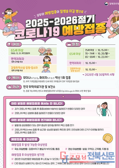 전북특별자치도 관계자는 “코로나19 예방접종은 고위험군의 중증화 예방에 중요하다”며 “65세 이상 어르신들은 코로나19와 인플루엔자 백신 동시 접종에 적극 참여해 주시기 바란다”고 당부했다.