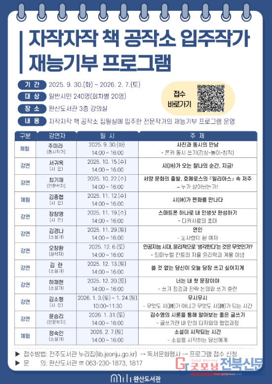 박남미 전주시 도서관평생학습본부장은 “이번 프로그램은 전문작가들이 시민과 직접 만나 지식과 경험을 나누는 뜻깊은 자리”라며 “많은 시민이 참여해 글 쓰는 창작의 기쁨을 함께 나누길 바란다”고 말했다.