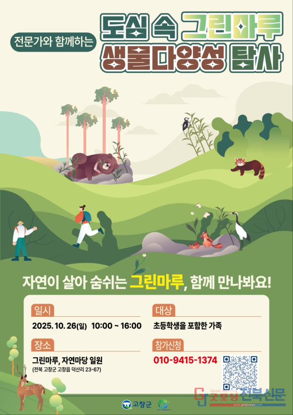 [굿모닝전북신문=최진수기자] 전북특별자치도 고창군이 도심 한복판에서 생태와 교육, 그리고 가족의 소통이 어우러지는 색다른 체험 프로그램을 준비했다. 군은 오는 26일 고창그린마루·자연마당 일원에서 열리는 ‘도심 속 그린마루 생물다양성 탐사대’의 참가자를 오는 22일까지 모집한다고 16일 밝혔다. 이번 행사는 자연과 인간의 공존을 배우며 생태적 감수성을 키우는 현장 중심형 교육으로 주목받고 있다.