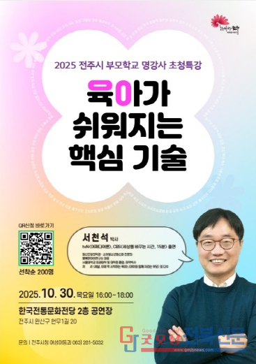 이번 특강은 유아 및 초등학생 자녀를 둔 학부모 200명을 대상으로 무료로 진행되며, 참여를 원하는 학부모는 전주시 누리집 및 네이버폼(QR코드)을 통해 선착순 신청하면 된다.