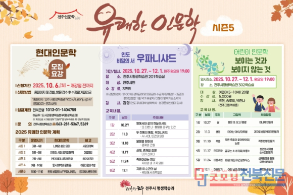 시는 오는 27일부터 12월 1일까지 매주 월요일과 화요일 오후 7시, 전주시평생학습관에서 시민들이 일상에서 인문학을 쉽게 접할 수 있도록 돕기 위한 ‘유쾌한 인문학’ 강좌를 운영한다.