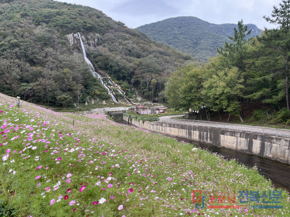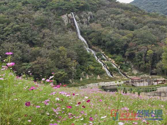 도솔폭포에 도착하면 가을의 정점이 터져 나온다. 폭포수가 쏟아지는 소리와 단풍이 맞부딪는 장관은, 도시의 소음을 완전히 지워버릴 만큼 압도적이다. 이곳은 단풍 명소이자, 그 자체로 하나의 천연 예술무대다. 특히 폭포 옆에 만개한 코스모스 꽃밭은 가을 하늘과 맞닿은 듯한 환상의 풍경을 선사한다. 수많은 관광객들이 카메라를 들고 코스모스 사이로 발을 옮기며, ‘가을을 찍는다’.