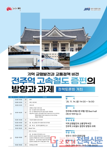 시와 전주시정연구원은 오는 11월 14일 오후 2시, 베스트웨스턴플러스 전주호텔 1층 베스트홀(완산구 현무1길 41)에서 ‘지역 균형발전과 교통정책 비전-전주역 고속철도 증편 방향과 과제’를 주제로 정책토론회를 개최한다.