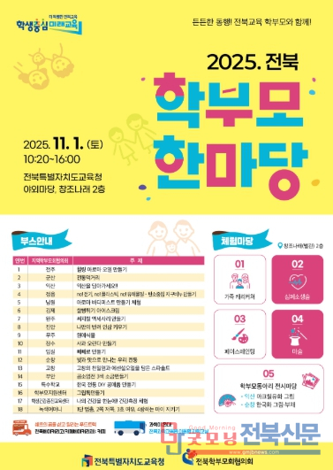 전북특별자치도교육청는 오는 11월 1일 본청 야외마당과 창조나래 2층에서 전북학부모회협의회와 공동 주최·주관하는 ‘2025. 전북학부모한마당’을 개최한다고 29일 밝혔다.