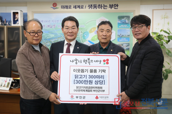 [굿모닝전북신문=최진수기자] 경기침체와 물가상승으로 서민경제가 짓눌린 현실 속에서도 지역사회 온정을 잃지 않는 손길이 이어지고 있다. (사)한국육계협회 부안군지부(지부장 박용석)가 지난 4일 부안군청을 찾아 닭고기 300마리, 총 300만 원 상당의 물품을 기탁했다. 이 기탁은 단순한 나눔을 넘어, 농가의 땀과 정성이 담긴 ‘따뜻한 연대의 행위’로 평가받고 있다.