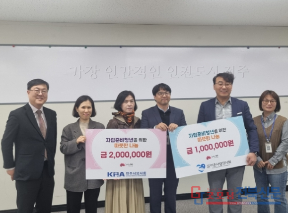 전주시는 5일 전주시 여의사회와 (사)이웃사랑의사회가 자립준비청년의 안정적인 사회 정착을 돕기 위해 각각 200만 원과 100만 원 등 총 300만 원의 후원금을 기탁했다고 밝혔다.