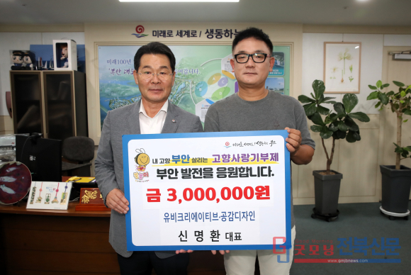 [굿모닝전북신문=최진수기자] 부안군이 최근 고향의 품에 따뜻한 소식을 전했다. 미디어 콘텐츠 매니지먼트 기업 유비크리에이티브와 디자인 전문업체 공감디자인을 운영하는 신명환 대표가 부안군에 300만원의 고향사랑기부금을 쾌척한 것이다.