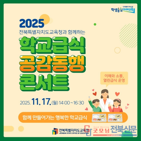 전북교육청은 17일 오후 2시 전주 치명자산성지 평화의전당에서 학생·학부모·교직원 등 교육공동체 100여 명이 함께하는 ‘2025. 학교급식 공감동행 콘서트’를 개최했다.