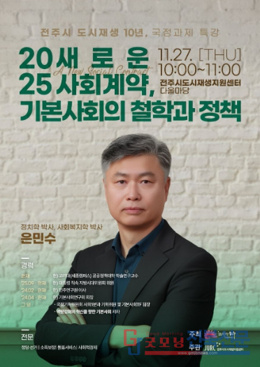 은 교수는 이날 특강에서 우리 사회의 복지와 돌봄, 소득 보장 등 기본적 삶의 조건을 다루는 ‘기본사회’의 개념을 중심으로, 지역 돌봄 정책과 사회적 연대의 철학을 풀어낼 예정이다.