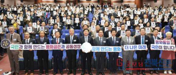 | ↑↑ 25일 전북특별자치도청 공연장에서 열린 민주평화통일자문회의 제22기 전북지역회의 출범대회에 김관영 도지사와 방용승 사무처장, 김영복 전북부의장등 참석자들이 퍼포먼스를 하고 있다 |