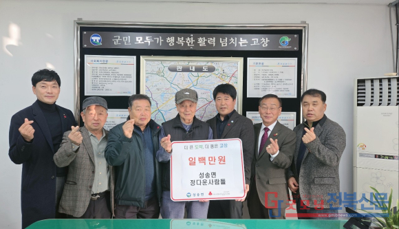 [굿모닝전북신문=최진수기자] 전북특별자치도 고창군 성송면에서 ‘고향을 향한 역송금(逆送金) 같은’ 따뜻한 소식이 전해졌다. 성송면 출신 회원들로 구성된 모임 ‘정다운사람들’(회장 이영엽)이 연말을 맞아 지역사회를 위한 기부를 이어가며, 올해는 고창군 기부금 200만원에 더해 성송면에 100만원을 추가로 기부했다. 한 번에 끝나는 이벤트가 아니라, 매년 반복되는 ‘지속형 나눔’이라는 점에서 지역사회가 주목하고 있다.
