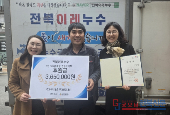 이번 후원은 지역사회로부터 받은 신뢰와 성원을 이웃에게 환원하겠다는 양인수 전북이레누수 대표의 철학에서 비롯된 것으로, 전북이레누수는 지난 2022년부터 올해까지 4년간 매년 365만 원씩 총1460만 원을 후원하며 따뜻한 나눔을 이어오고 있다.