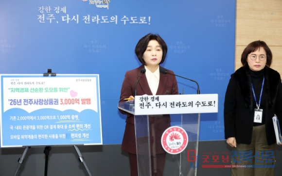 임숙희 전주시 경제산업국장은 “전주시는 2025년 한 해 침체된 민생경제의 회복을 위해 골목상권 활성화 등 다양한 정책을 추진해왔다”면서 “다가오는 2026년 새해 전주사랑상품권 발행 규모 증액 및 특례 보증 대출금 확대 등 지역경제 활성화를 위한 마중물을 확보해 상권의 회복이 가시화될 수 있도록 전력을 다하겠다”고 말했다.
