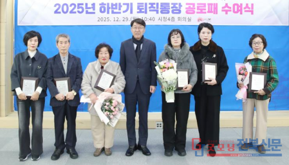 시는 29일 시청 4층 회의실에서 ‘2025년 하반기 임기만료 퇴직통장 공로패 수여식’을 개최하고, 하반기 임기를 마치고 퇴직하는 통장 95명(완산구 47명, 덕진구 48명)에게 공로패를 수여했다.