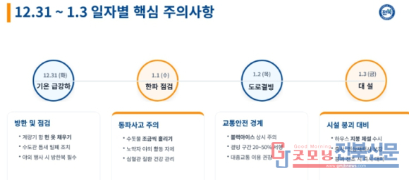오택림 전북특별자치도 도민안전실장은 “전북자치도는 연말연시 대설과 한파 속에서도 도민과 방문객이 안전하게 해넘이와 해맞이를 즐길 수 있도록 모든 행정역량을 총동원하겠다”며 “도민 여러분도 따뜻한 옷차림과 행동요령 숙지로 사고 없이 새해를 맞이하길 바란다”고 말했다.