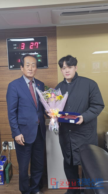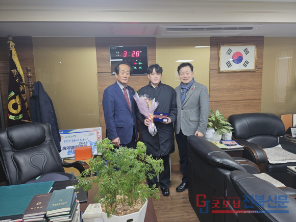 | 왼쪽부터 유덕근 고창농협 조합장 이준범 수상자 오세환 고창군의원 / 굿모닝 전북신문 |