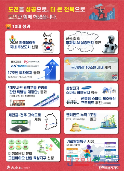 전북자치도는 지난 3여 년간 이어온 끊임없는 도전과 이뤄 왔던 성과 위에서 한계를 뛰어넘고 기대를 충족하는 성취를 이뤄내, 그 결실이 도민의 삶 전반에 온전히 공유되도록 하겠다고 밝혔다.