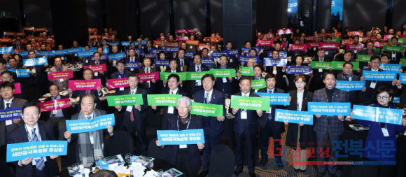 | ↑↑ 새해를 맞아 8일 서울 더 플라자 호텔에서 열린 2026년 전북특별자치도민회 중앙회 신년인사회에 김관영 전북특별자치도지사와 곽영길 전북특별자치도민회중앙회, 정청래 더불어민주당 대표, 정동영 통일부 장관 등 주요 인사와 수도권 출향도민 500여 명이 참석해을 비롯한 500여명의 출향도민들이 하계올림픽 전북 유치 퍼포먼스를 하고 있다. |