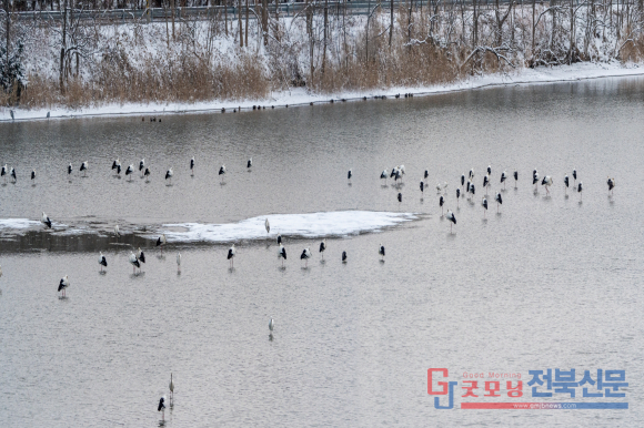 [굿모닝전북신문=최진수기자] 전북특별자치도 고창군 해리천이 멸종위기종 1급이자 천연기념물인 황새들의 핵심 월동지로 다시 확인됐다. 고창군은 9일 해리천 일원에서 황새 80여 마리가 월동 중인 사실을 확인했다고 밝혔다.