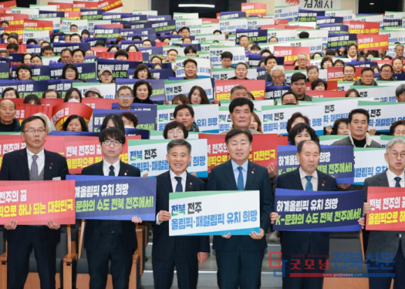 | ↑↑ 9일 김제시청에서 열린 `도민과 함께하는 2026년 시군 방문`에 김관영 전북특별자치도지사와 정성주 김제시장 및 참석자들이 도민과의 대화 시간을 갖고 `하계올림픽 유치희망 K-문화의 수도 전북 전주에서` 피켓을 들고 기념촬영을 하고 있다 |