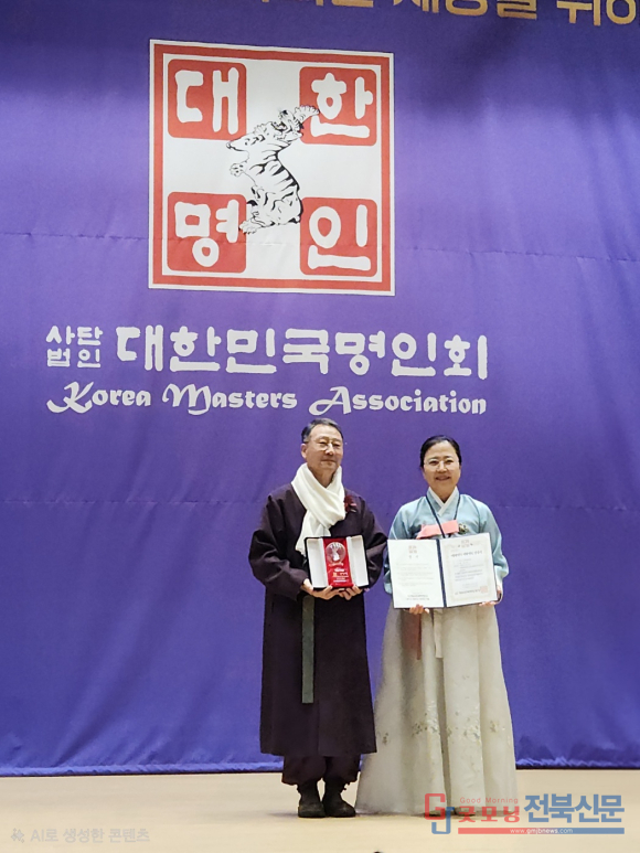 [굿모닝전북신문=최진수기자] 대한불교조계종 제24교구 본사 선운사에서 차 봉사와 전통다례 전수에 헌신해 온 선운다회 회장 강미정(고창 흥덕)이 2025년 ‘대한민국 다도명인’으로 선정됐다. 강 회장은 2025년 12월 29일 국회의사당에서 증서를 수여받으며, 지역 기반 차 문화 확산과 전통다례 전승 활동의 성과를 공식 인정받았다.