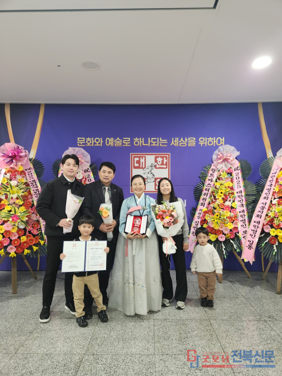 | 강 회장은 2025년 12월 29일 국회의사당에서 증서를 수여받고 가족들과 함께 기념촬영을 하고있다 / 굿모닝 전북신문 |