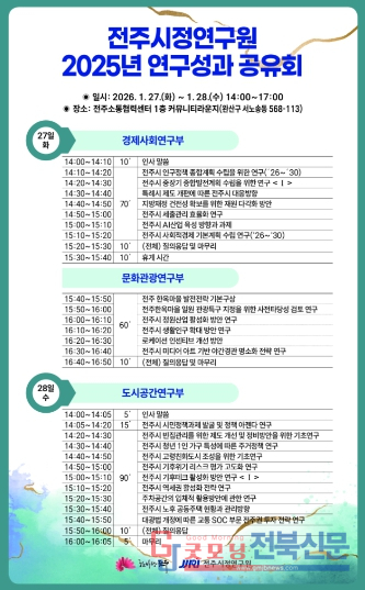 첫째 날인 27일에는 경제사회연구부와 문화관광연구부의 연구성과 발표가 진행된다. 경제사회연구부에서는 ▲전주시 인구정책 종합계획 수립 연구(’26~’30) ▲전주시 중장기 종합발전계획 수립을 위한 연구 `Ⅰ` ▲특례시 제도 개편에 따른 전주시 대응방향, ▲지방재정 건전성 확보를 위한 방안 ▲전주시 세출관리 효율화 연구 ▲전주시 AI산업 육성 방향과 과제, ▲전주시 사회적경제 기본계획 수립 연구(‘26~’30)를 발표한다. 이어 문화관광연구부에서는 ▲전주 한옥마을 발전전략 기본구상, ▲전주한옥마을 일원 관광특구 지정을 위한 사전타당성 검토 연구, ▲전주시 정원산업 활성화 방안 연구, ▲전주시 생활 인구 확대 방안 연구, ▲로케이션 인센티브 개선 방안, ▲전주시 미디어 아트 기반 야간경관 명소화 전략 연구 등 결과를 공유한다.