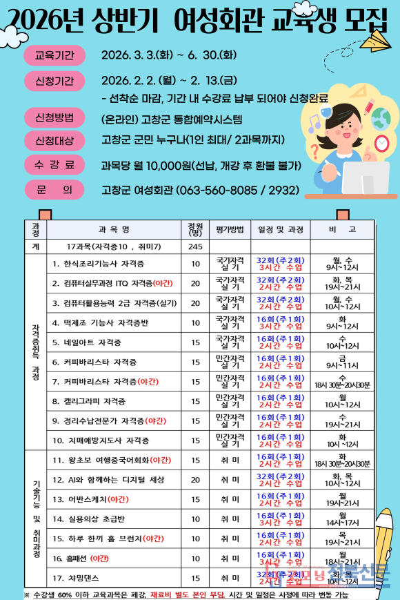 [굿모닝전북신문=최진수기자] 전북특별자치도 고창군이 군민의 여가·자기계발 수요를 정면으로 받는다. 군은 오는 13일까지 2026년 상반기 고창군 여성회관 교육 수강생을 모집하고, 3월 3일 개강해 6월 30일까지 4개월간 17개 과정을 운영한다.