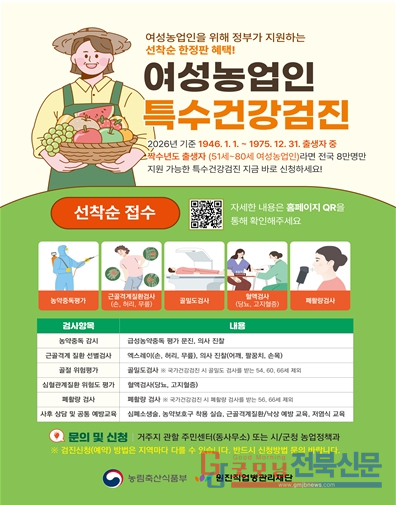 지원 대상은 51세부터 80세까지의 짝수년도 출생 여성농업인으로, 검진비의 10%만 본인이 부담하면 된다. 신청은 거주지 동 주민센터 또는 ‘농업e지’ 앱을 통해 가능하다.