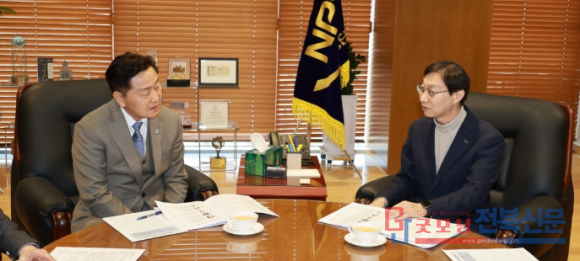 | ↑↑ 3일 전주 혁신도시 국민연금공단 이사장실에서 김관영 도지사와 김성주 이사장이 전북 금융중심지 지정 및 자산운용 금융생태계 조성 협력 방안을 논의하고 있다 |