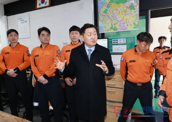 | ↑↑ 김관영 전북특별자치도지사는 설 명절을 앞둔 9일 효자119안전센터 및 관내 소방기관을 방문하여 ˝도민들이 안전하고 따뜻한 명절을 보낼 수 있도록 최선을 다해 달라˝며 당부하고 현장 근무자들에게 감사의 마음을 전하고 있다 |