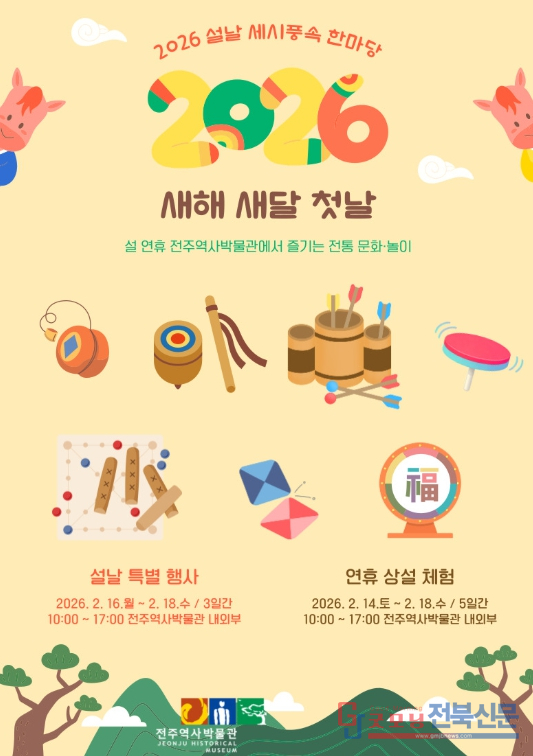 먼저 전주역사박물관은 ‘2026 세시풍속 한마당(설) `새해 첫 달 첫 날`’을 주제로 설 명절의 의미를 되새기고 가족이 함께 즐길 수 있는 다양한 전통 체험 프로그램을 마련했다.