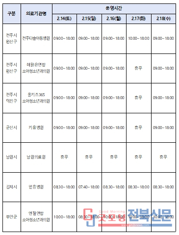 권역응급의료센터 등 주요 응급의료기관의 과부하를 줄이고 경증 환자의 외래 진료 공백을 최소화하기 위해, 연휴 기간 하루 평균 의료기관 459개소와 약국 240개소가 운영된다. 특히 소아 응급환자 진료 공백을 최소화하기 위해 예수병원 소아전문응급의료센터는 24시간 운영되며, 달빛어린이병원과 원광대학교병원 권역응급의료센터 소아진료실도 정상 운영된다.