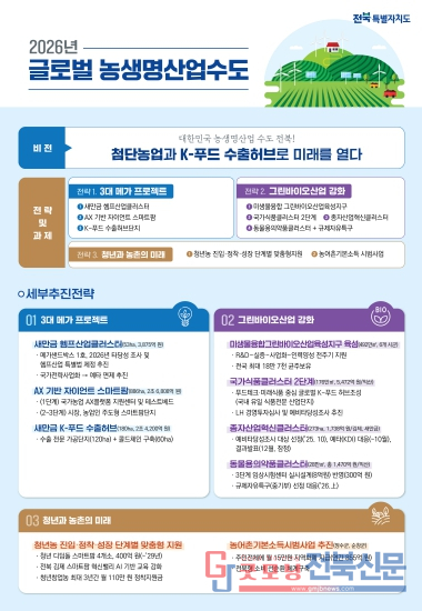 전북특별자치도는 11일 2026년 농생명산업 분야 브리핑을 통해 올해를 전북 농업 대전환의 원년으로 삼고, 새만금 농생명용지를 중심으로 첨단 농생명산업과 K-푸드 수출 인프라를 전략적으로 육성해 전북을 명실상부한 대한민국 농생명산업 수도로 완성해 나가겠다고 밝혔다.