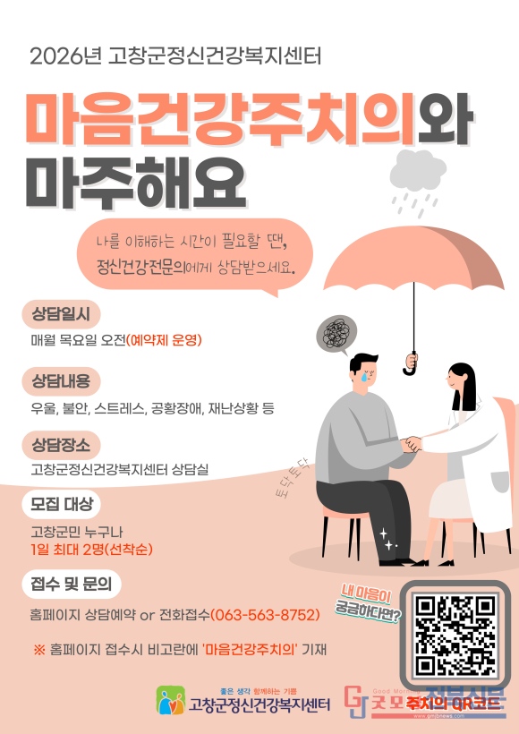 고창군정신건강복지센터(센터장 김성수)가 지역주민의 마음 건강 증진을 위해 2026년 ‘마음건강주치의’ 사업을 운영하고 있다. 이 사업은 정신건강의학과 전문의와의 1:1 맞춤형 상담을 핵심으로, 주민이 겪는 정신적 부담을 ‘참는 문제’로 방치하지 않고 ‘관리 가능한 건강 문제’로 끌어내는 데 초점을 맞췄다.