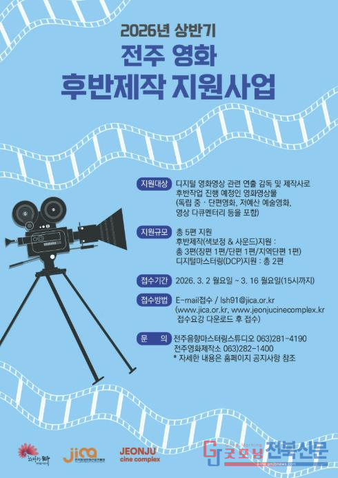 (재)전주정보문화산업진흥원과 전주영화제작소는 오는 3월 16일까지 대한민국 독립영화 제작 환경개선과 우수 작품을 발굴하기 위한 ‘2026년 상반기 전주 영화 후반제작지원 사업’에 참여할 작품을 공개 모집한다고 23일 밝혔다.