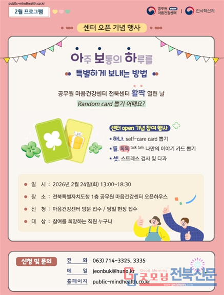 공무원 마음건강센터는 `공무원 재해보상법` 제46·47조 및 시행령 제57조에 근거해 인사혁신처가 민간 심리상담 전문기관(휴노)에 위탁 운영하는 기관이다. 서울(2008년)을 시작으로 전국에 순차 설치돼 온 이 센터는 이번 전북센터 개소로 전국 11번째 거점을 확보하게 됐다. 도청 1층 전 법률상담실을 리모델링해 올해 2월 공사를 완료한 뒤 약 2주간의 준비 기간을 거쳐 문을 열었다.