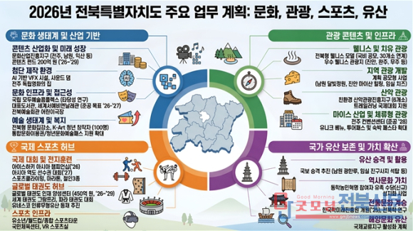 도는 국가유산의 체계적 보존과 활용을 통해 도민의 문화 향유 기반을 확대하고, 이를 미래 성장 자원으로 연결할 계획이다. 남원 광한루, 임실 진구사지 석등 등 도내 문화·자연유산을 발굴해 국보·보물·사적 등 25건의 국가지정을 단계적으로 추진하고, 동학농민혁명의 역사적 가치를 확산하기 위해 유족 수당을 올해 처음 지급하는 한편 고창·부안 일대 성지화 사업과 세계시민혁명의 전당 건립도 이어간다.