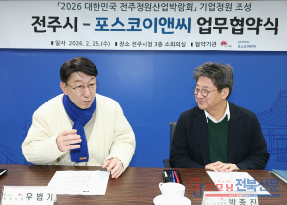 전주시와 ㈜포스코이앤씨은 25일 시청 3층 소회의실에서 우범기 전주시장과 박종진 ㈜포스코이앤씨 건축사업본부장 등 양 기관 관계자들이 참석한 가운데 ‘2026 대한민국 전주정원산업박람회 기업동행정원 조성을 위한 업무협약’을 체결했다.