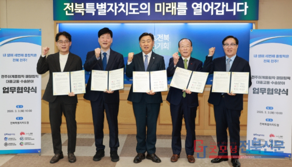 | ↑↑ 3일 전북특별자치도청 회의실에서 열린 전주하계올림픽·패럴림픽의 성공적인 유치를 위한 대중교통․수송분야 업무협약에 김관영 도지사와 윤동욱 전주부시장, 황의종 전북특별자치도버스운송사업조합 이사장, 박형택 전북특별자치도전세버스운송사업조합 이사장, 김공선 전북특별자치도택시운송사업조합 부이사장이 협약식을 갖고 있다 |